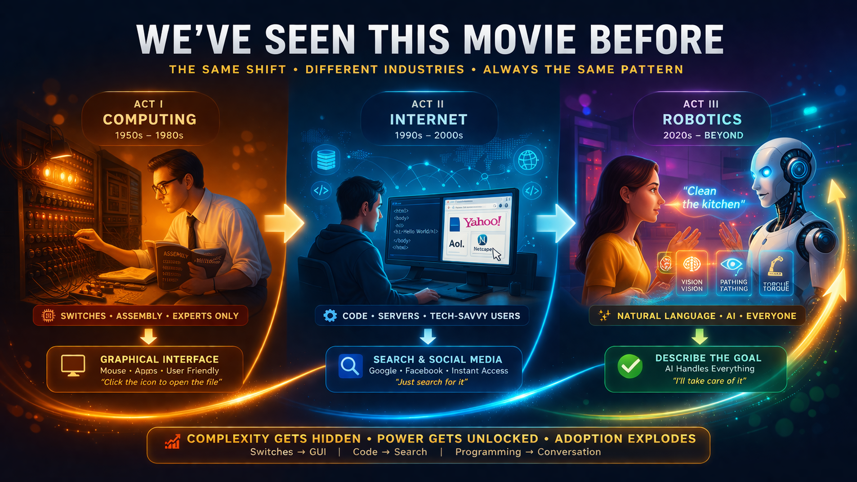 This is not a speculative fantasy. It is a repeatable technology pattern: first the experts control the tools, then middleware simplifies development, and finally natural interaction opens the door to everyone. Robotics is now moving through that same progression.