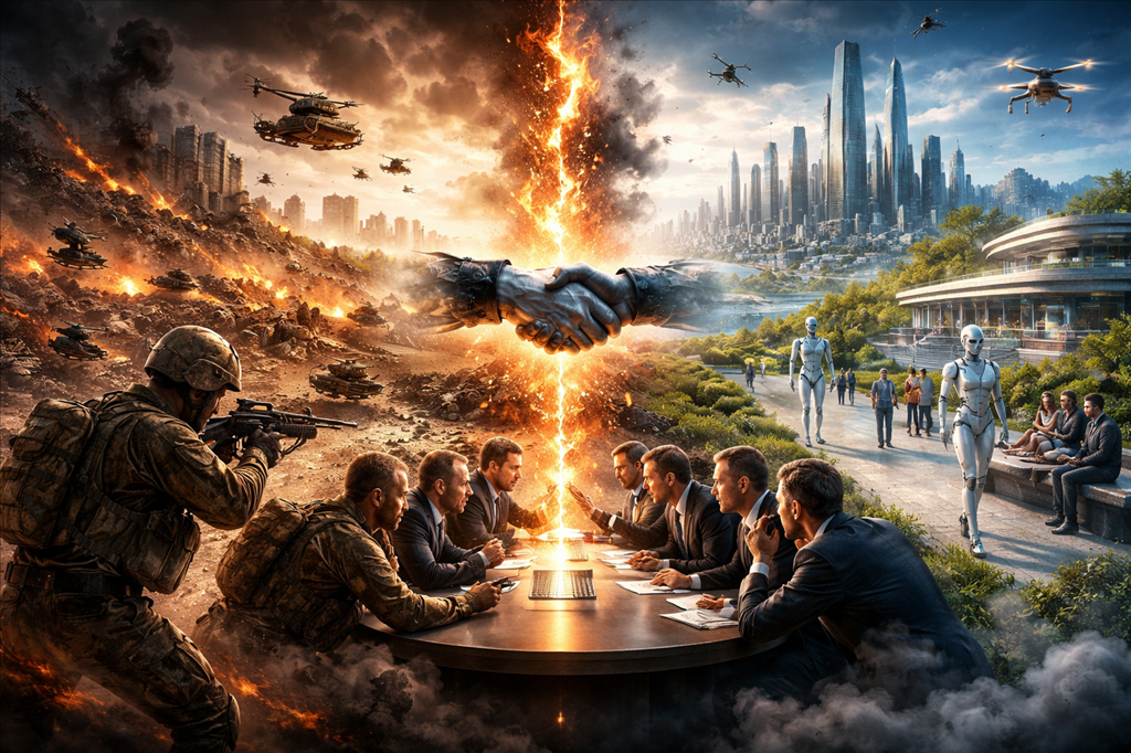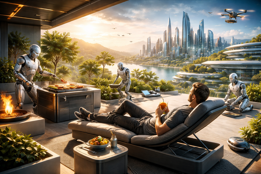 Robots replace human effort across all domains—physical labor, intellectual tasks, and even creative work.