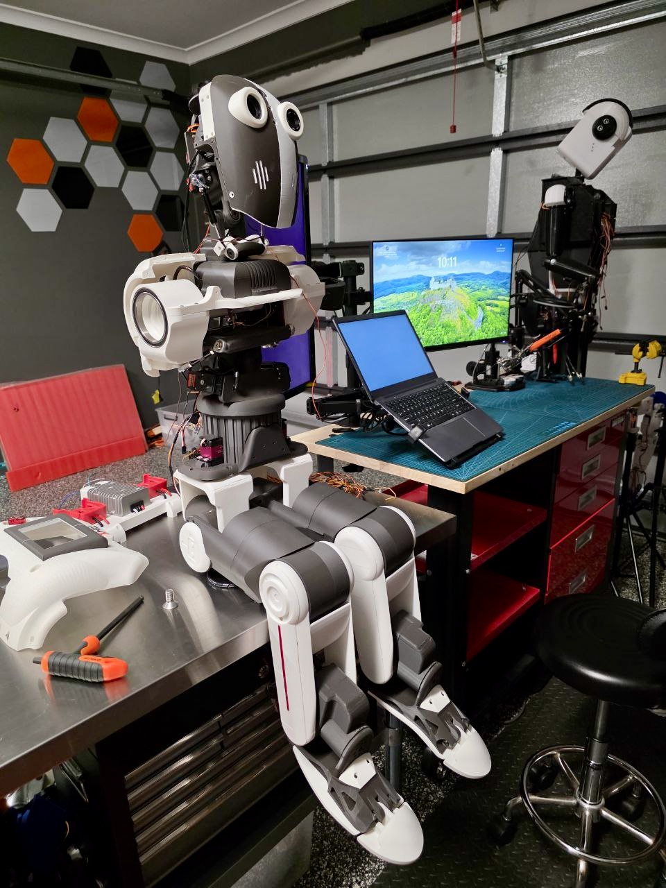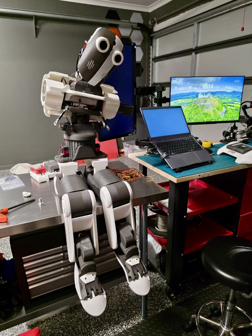 The XR-2 supports two single-board computers (SBCs). It uses a PC mounted behind the display in the chest to support Synthiam ARC, allowing for seamless robot programming and control. Additionally, it has a designated space for mounting a Jetson Orin Nano just above the PC below the neck, which enhances its onboard AI server capabilities. On the back, there is a custom servo breakout board featuring two Mega Minis and USB ports. The power supply consists of two 20V power tool batteries. The robot boasts 49 degrees of freedom and supports two cameras. There is also space to accommodate up to 10 small Arduinos or sensors in each leg, allowing for extensive customization. Almost every joint in the robot uses bearings to relieve structural stress from the servos. However, it is important to note that the XR-2 is a relatively heavy robot.