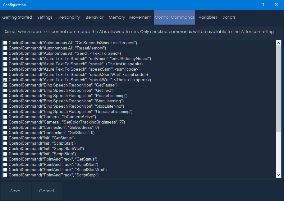 There are Control Commands available for this robot skill which allows the skill to be controlled programmatically from scripts or other robot skills. These commands enable you to automate actions, respond to sensor inputs, and integrate the robot skill with other systems or custom interfaces. If you're new to the concept of Control Commands, we have a comprehensive manual available here that explains how to use them, provides examples to get you started and make the most of this powerful feature.