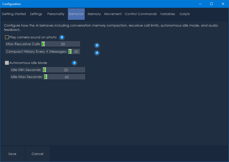- Pause Checkbox - Suspends all autonomous behavior including the idle timer, behavior loop, and idle sway servo oscillation. Use this when you want the robot to stop acting on its own. Unchecking it resumes all autonomous systems.