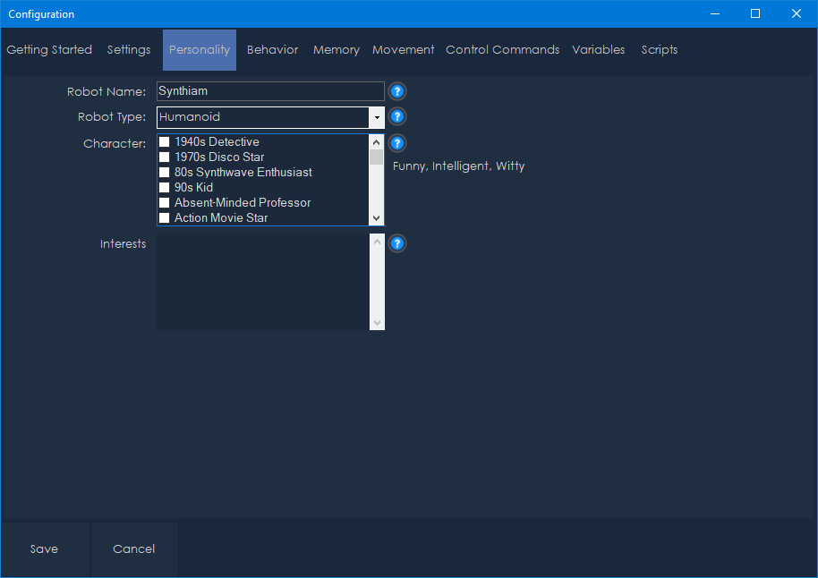 - The character traits and interests significantly affect the robot's conversational style. Experiment with different combinations.