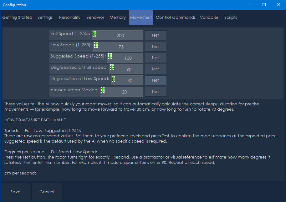 - Use the Test buttons to verify each speed setting matches your robot's actual performance.