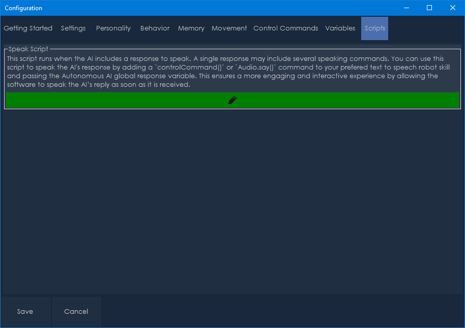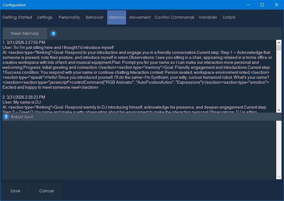 - Script Log - Shows the output from any JavaScript code the AI executes on the robot, including movement commands, animations, and control commands.
