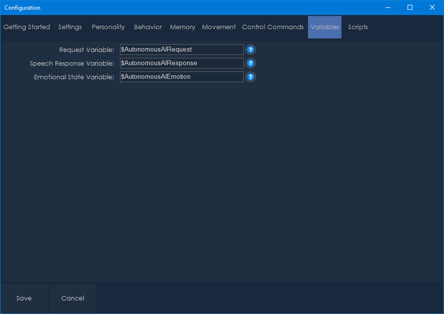 - Emotion - The AI's current emotional state (happy, sad, excited, nervous, anxious, lonely, etc.), stored to a variable for use by other skills.