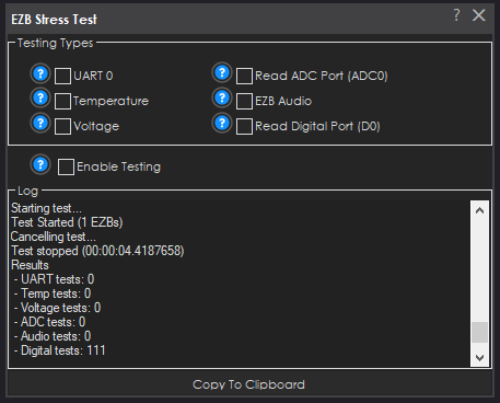 4. Check the test types that you wish to test. Read about each test below in their own section. Ensure the type of test is supported by your EZB. For example, Arduinos do not have audio capability and some may not have UART capability.