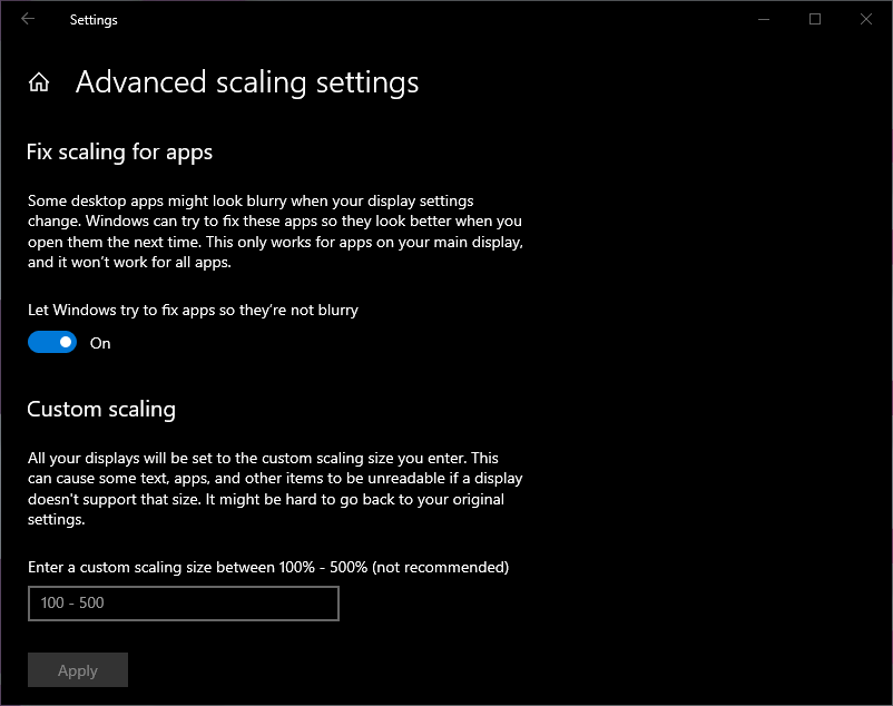 • Enable “Fix scaling for apps” in Advanced Scaling Settings